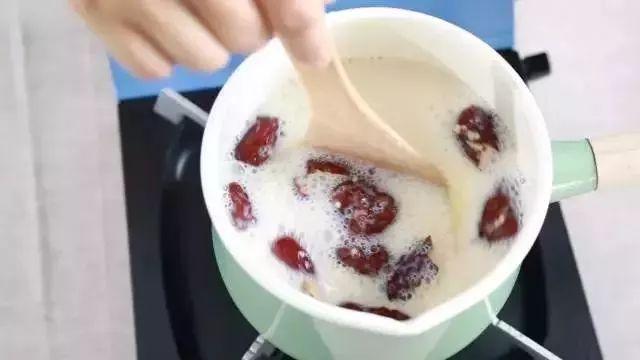 用料:豆浆500g、小米80g、蒸熟去皮的山药240g、大枣3个、水适量、糖适量
