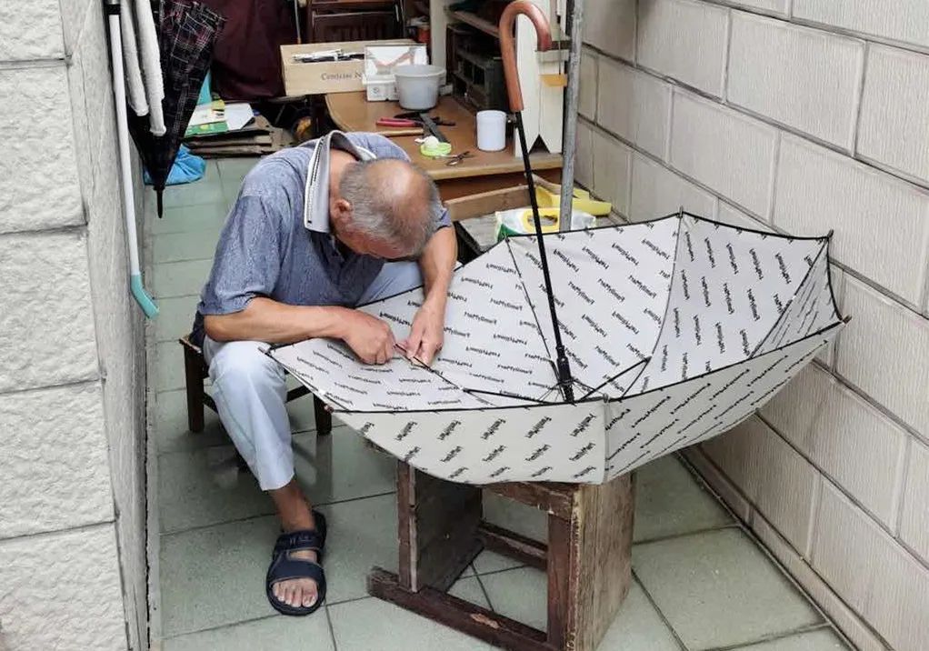 原来,这些都是老庞修好的旧伞、坏伞。庞元宗说,最先开始动修伞的念头,只是因为自己刚买没多久的伞坏了伞骨,“自己动手修一修,旧雨伞还能用的部件就拆下来换给新雨伞。”