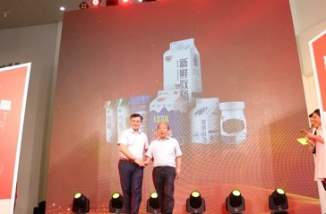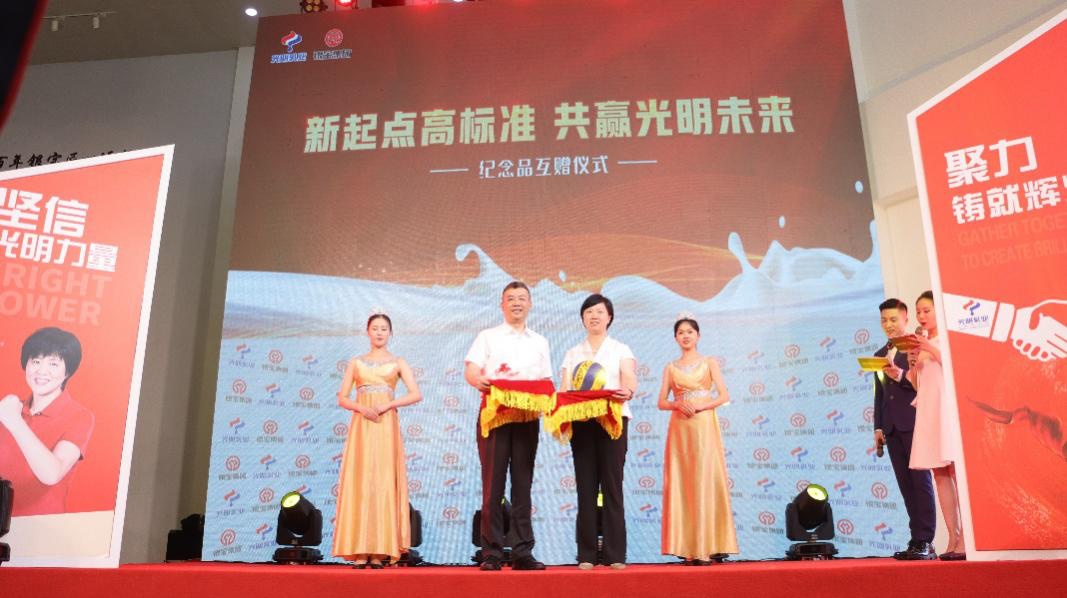 致辞结束后,光明乳业党委副书记、总裁罗海和射阳县委副书记、县长吴冈玉互赠纪念品,表达双方战略合作的伙伴之情。