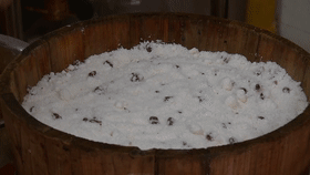 桶蒸糕的个头很大,制作一整块糕需要6、7斤米粉,有白糖、红糖、蜜枣、赤豆红糖、核桃红枣等口味。