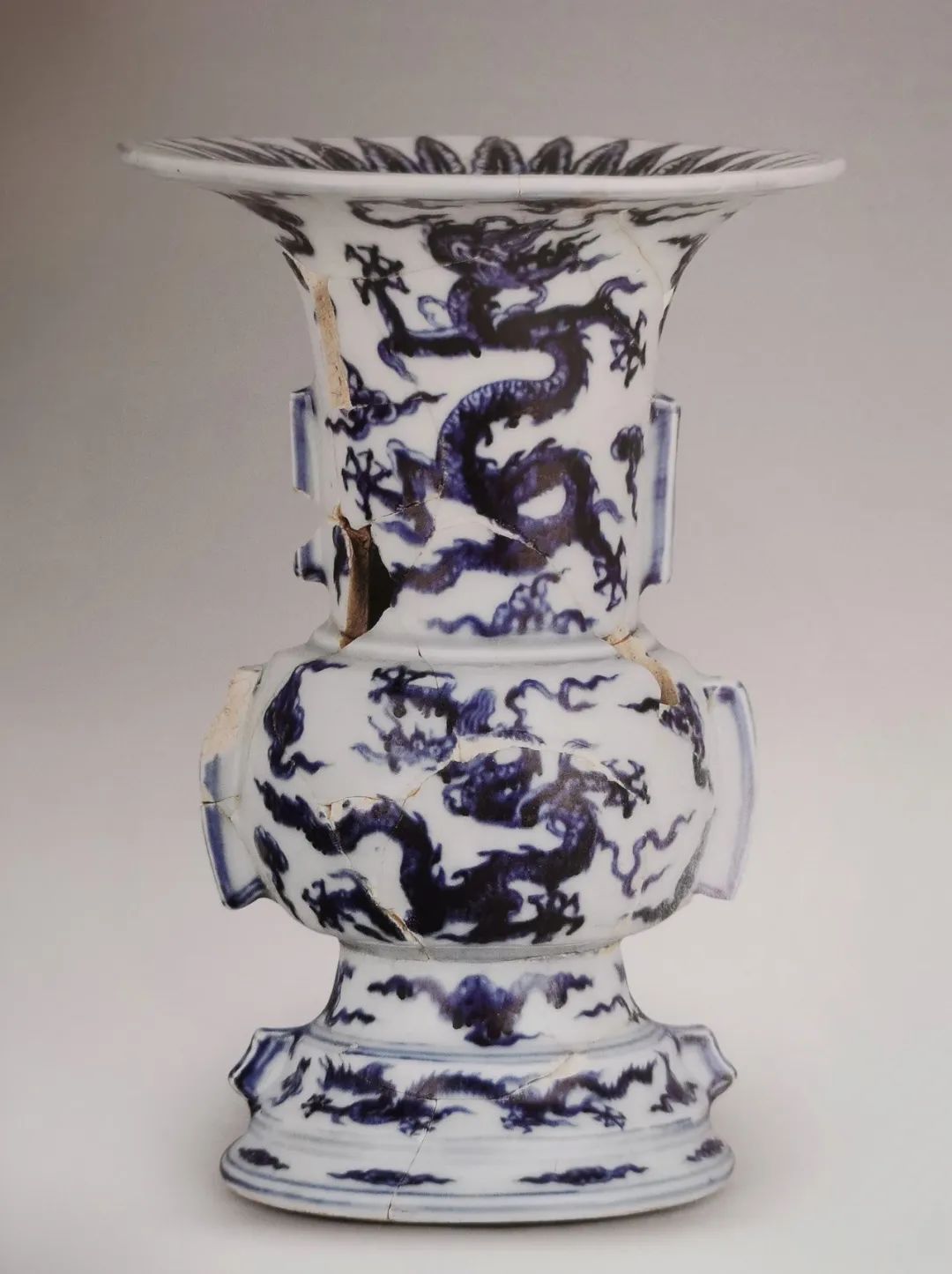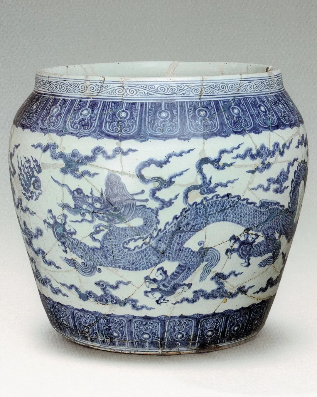 1988年发掘出土的正统朝青花云龙纹大缸残片,多达数吨。复原出的最大者高75.5厘米,腹径约88厘米,形体之大,绝无仅有。