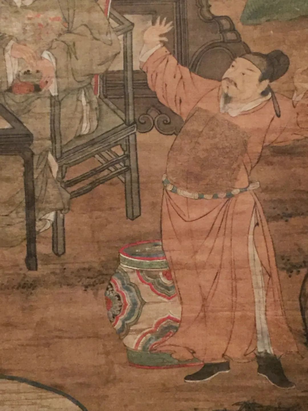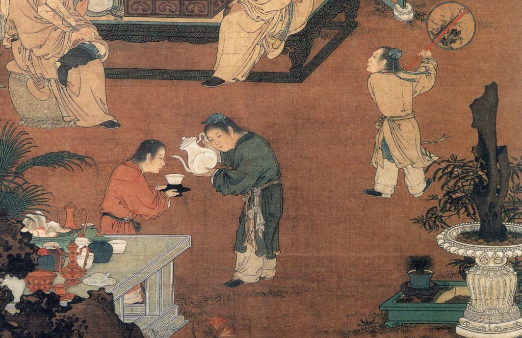 成化朝《御花园赏玩图》长卷传世,题跋记“茶烟湿润,清五腑之精神”,是宪宗接受奉茶的场景。明人《十八学士图》中,有鸡心扁身的白釉茶瓶与茶盏配合使用的细节。