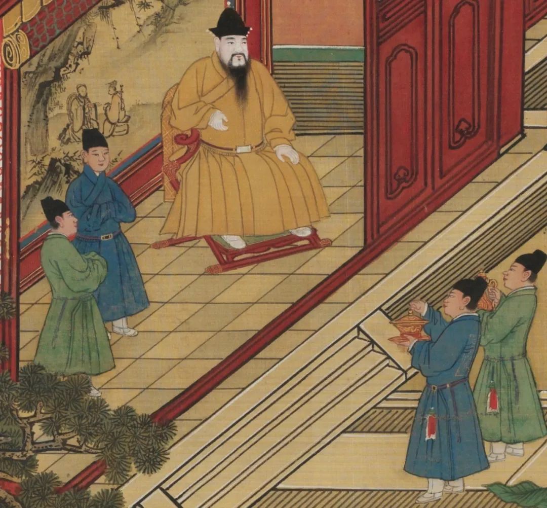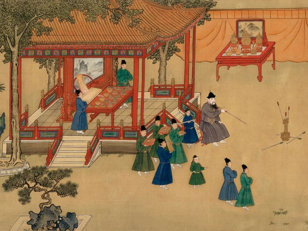 亭内膳桌上,膳食已备妥,膳亭左侧前方设一酒桌。宪宗右侧应是尚膳监太监四人,分别手捧酒注、劝盘、脯醢酒果侍奉。
