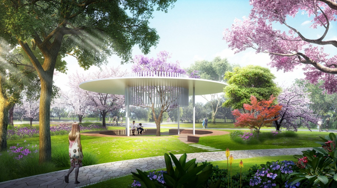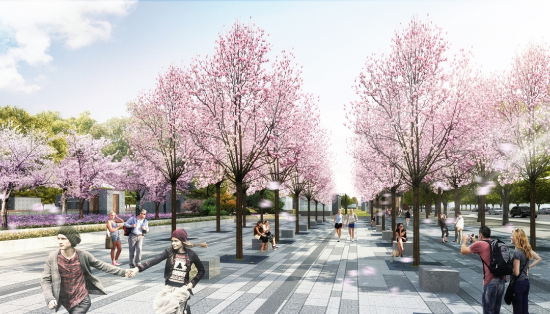 在设计中,将玉兰花与水相互融合,综合考虑地形,将绿地与广场、建筑物及各类景观下品结合,创造出人性化、人文化的景观绿地,将城市绿地打造成为活力纽带、文化窗口、市民舞台和生态延续的载体。