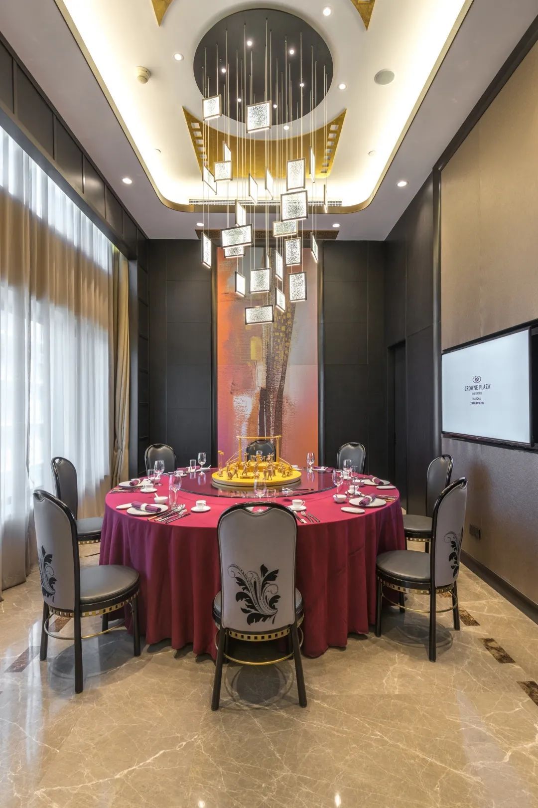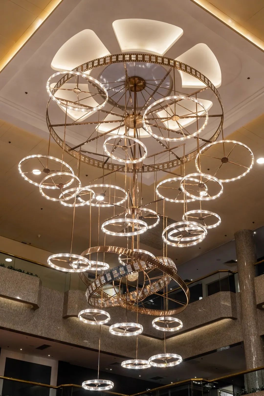 抬头看,悬挂在酒店大堂上的灯具是为酒店定制的电影主题灯具,灯具以胶片为主要造型元素,同时它还随时间而旋转运动。可以说,这组装置也以其造型及运动感迎合了电影的机械属性和工业属性。