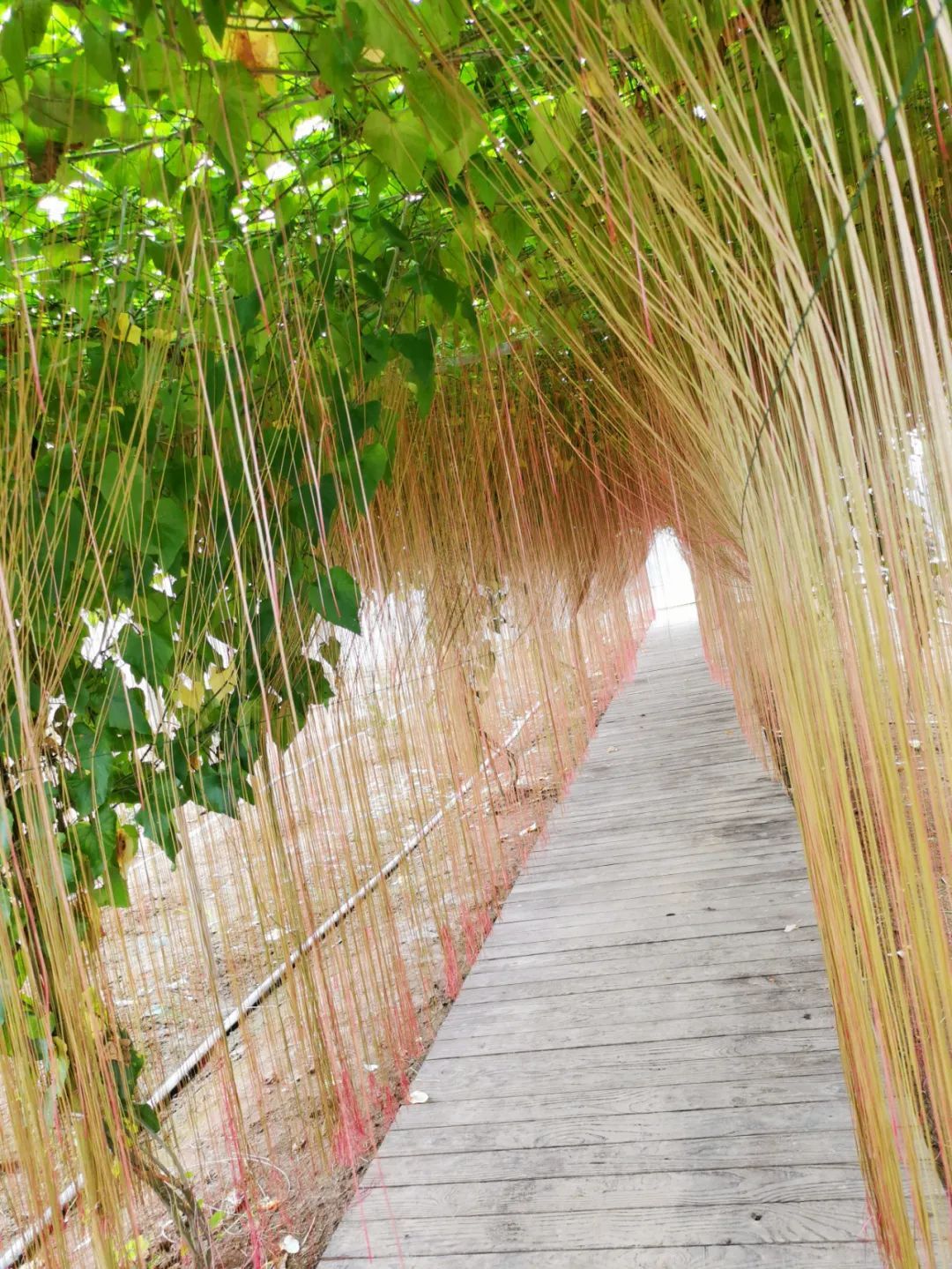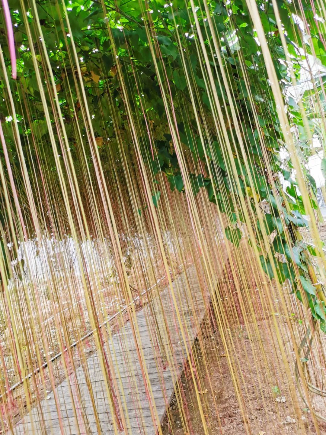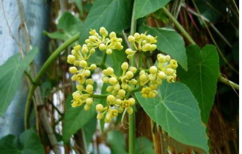 “一帘幽梦”全体无毛,枝条纤细,有卷须;叶心形状,叶缘有锯齿;夏秋季开淡绿色的花,7-8月结果。它的特别之处在于其从茎节长出红褐色的细长气根,可长达3米,数百或上千条垂悬于棚架下,风格独具,当清风徐徐吹拂时,气根也随风摇曳,极富诗情画意!眼前的这“一帘幽梦”,是否让你想到了剪不断、理还乱的情丝?