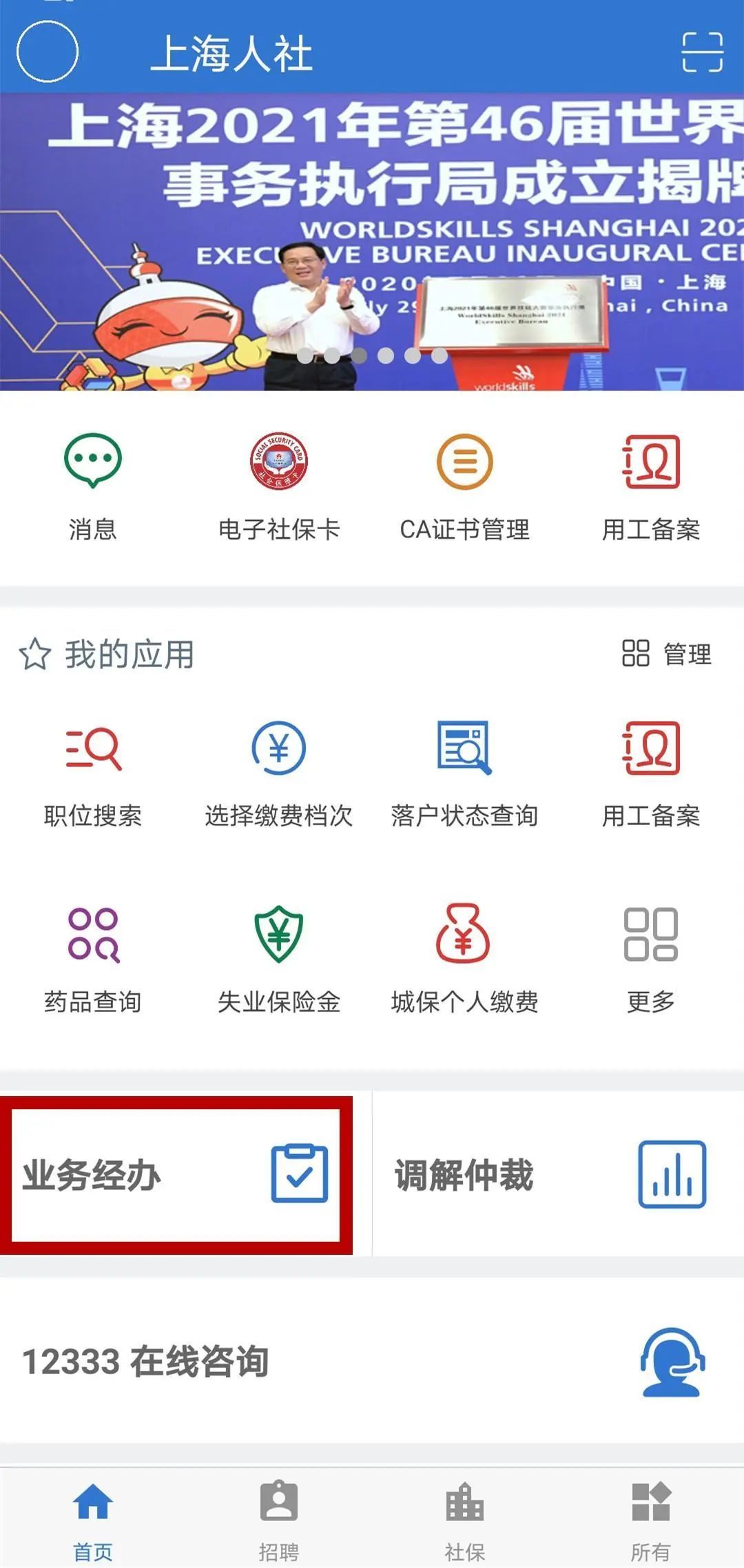 进入“上海人社”APP后,选择“业务经办”,进入登录认证页面。