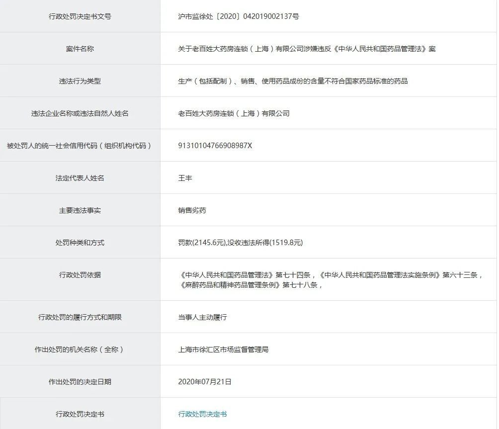 日前,上海市药监局发布行政处罚决定书(沪市监徐处〔2020〕042019002137号)显示,老百姓大药房连锁(上海)有限公司因销售劣药被罚没共计3665.4元。