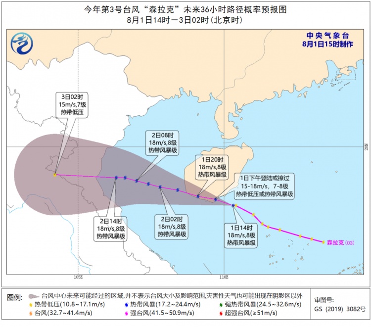 “森拉克”今天14时中心位置北纬18.1度、东经110.3度;强度等级为热带风暴;最大风力8级,18米/秒(约65公里/小时);中心气压992 hPa;参考位置距离海南省三亚市偏东方向约85公里;“森拉克”将以每小时25公里左右的速度向西偏北方向移动。