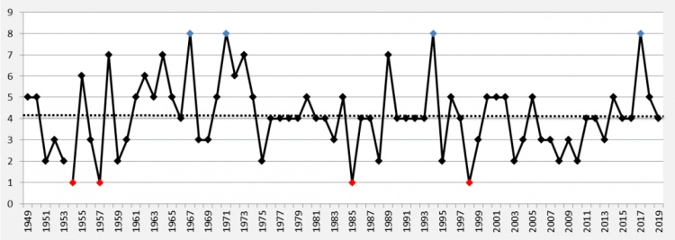 1949年-2019年,平均每年7月生成台风4.1个,登陆台风1.9个。其中生成最多年份为1967,1971,1994,2017年(8个);生成最少年份为1954,1957,1985,1998年(1个)。