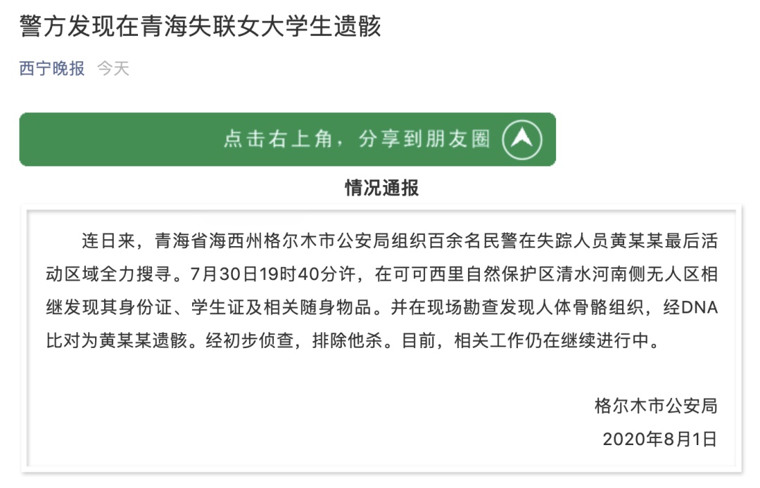 8月1日,青海省格尔木警方发布通报,独自前往青海旅游的女大学生黄某某遗骸于7月30日被找到,经初步侦查,排除他杀。具体如下↓
