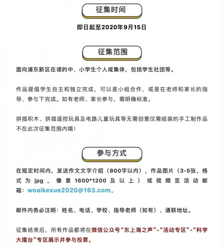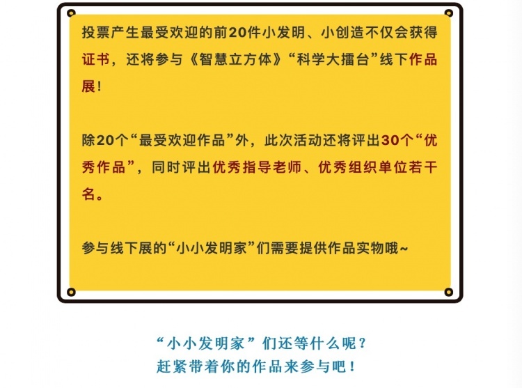 最受欢迎的20件小发明、小创造及部分优秀作品还有机会参与《智慧立方体》“科学大擂台”线下作品展!