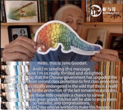 听到来自中国的好消息——穿山甲被提升为国家一级保护野生动物后,古道尔特意在英国老家录制了一段视频。