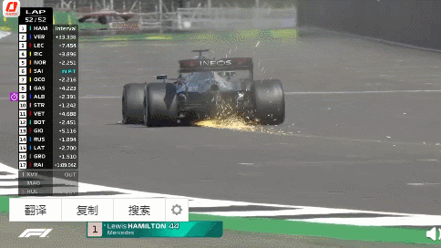 赛车底盘摩擦地面,擦出炫目火星。车体向左倾倒,但赛车依旧在赛道上飞驰。此时的银石赛道上,汉密尔顿距离2020赛季F1英国大奖赛的冠军,只剩最后半圈。