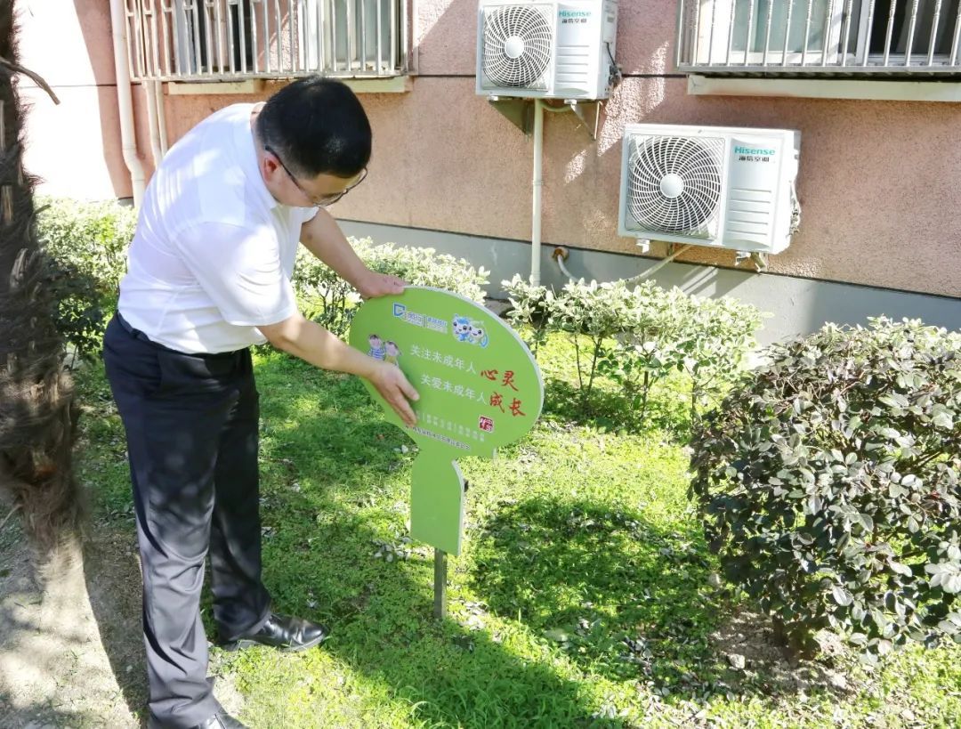 一块牌子指的是小区绿化带里第一块创全宣传标牌。陈宇剑特地拿手摸了摸表面的灰尘。小区里的创全宣传标牌在露天日晒雨淋,有些蒙上了灰尘,有些已经破损。陈宇剑和社区工作者、志愿者说:“还请大家平时多多关注这些地方,脏了就擦一擦,坏了就换一换,拜托大家了。”