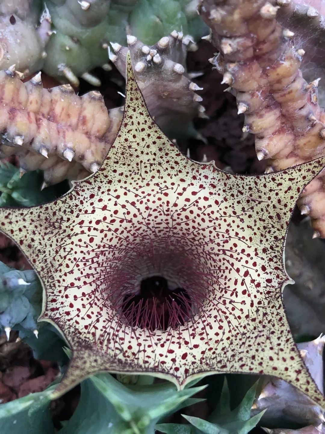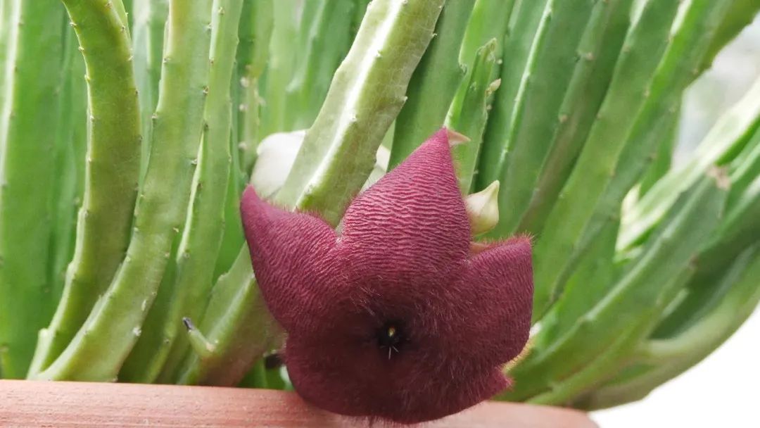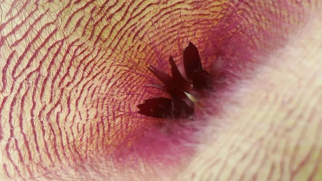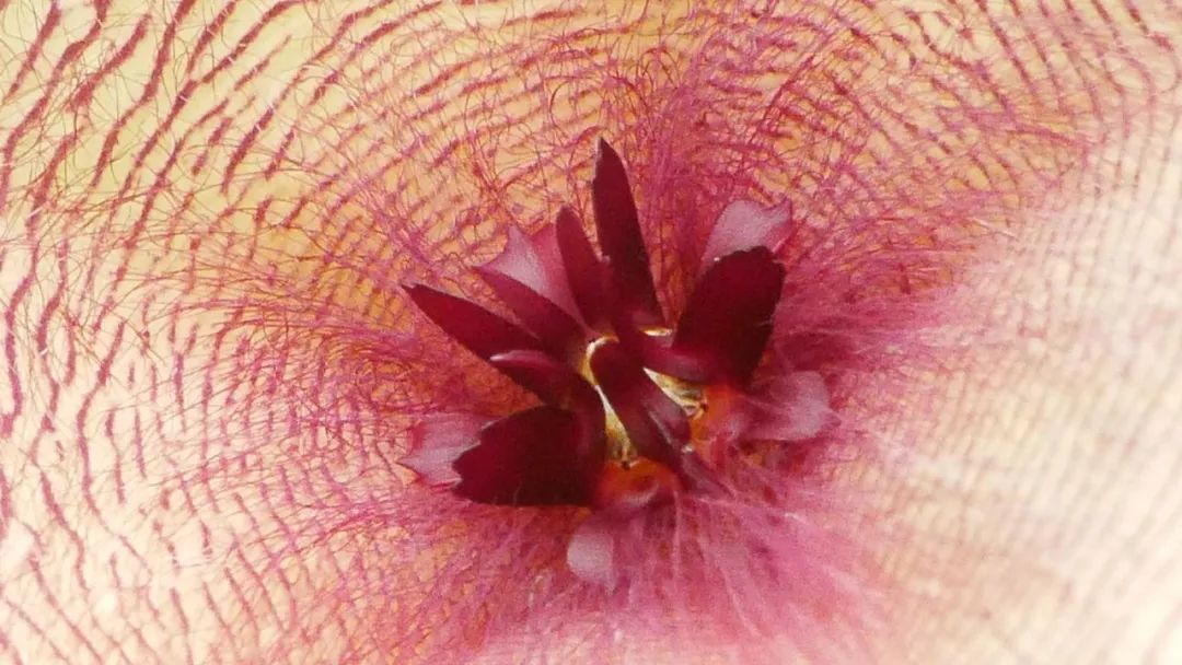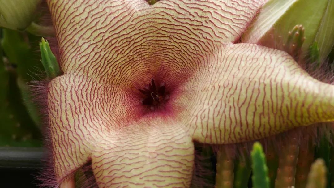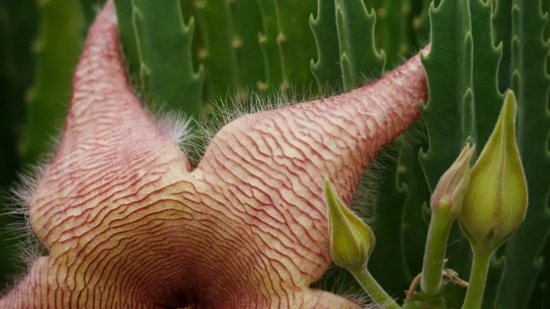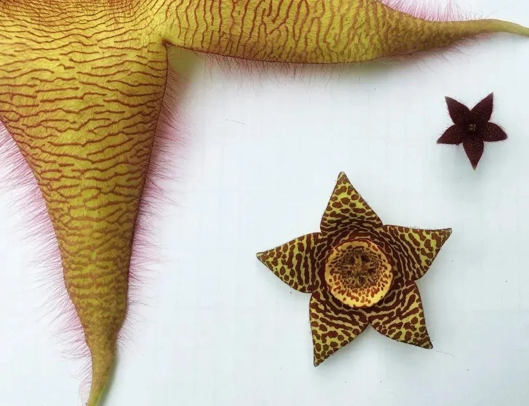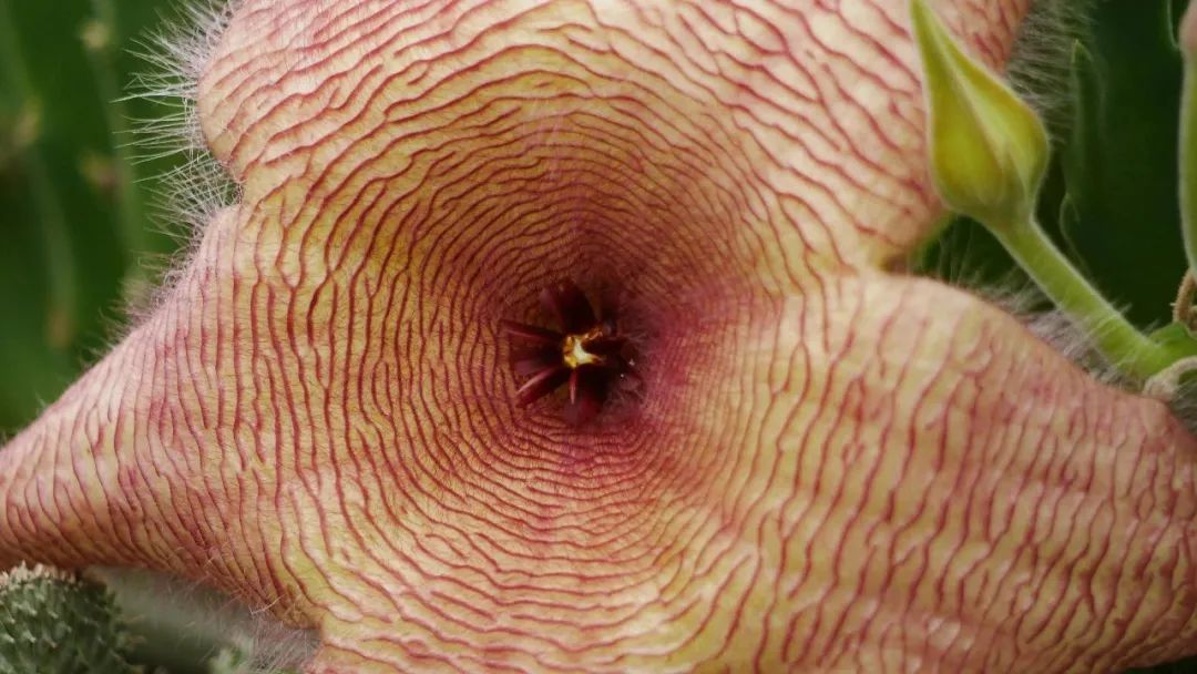 这种五瓣大花有点变化多端,或多或少有淡红色或淡黄色的突起,不同程度地与白色毛发交织在一起,散发出腐烂腐肉的臭味。花瓣边缘也有白色的毛发。原产于南非。花苞未开放的时候还蛮像嫩牛五方的!