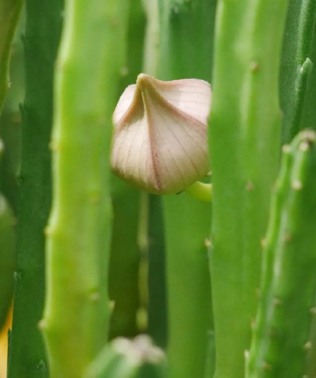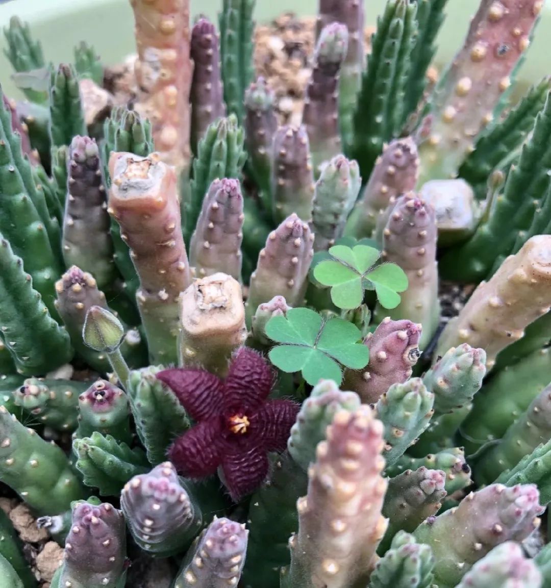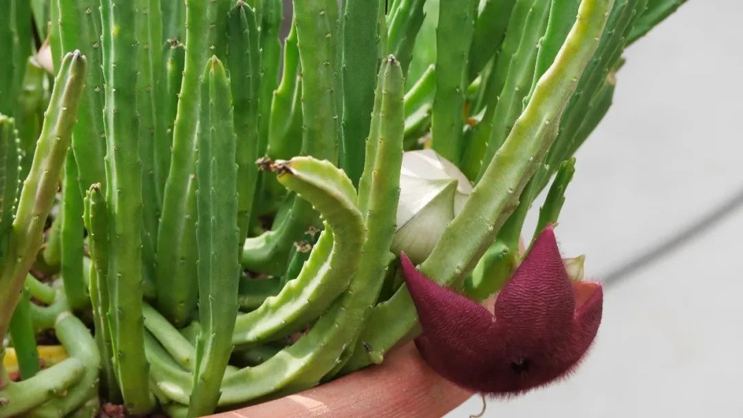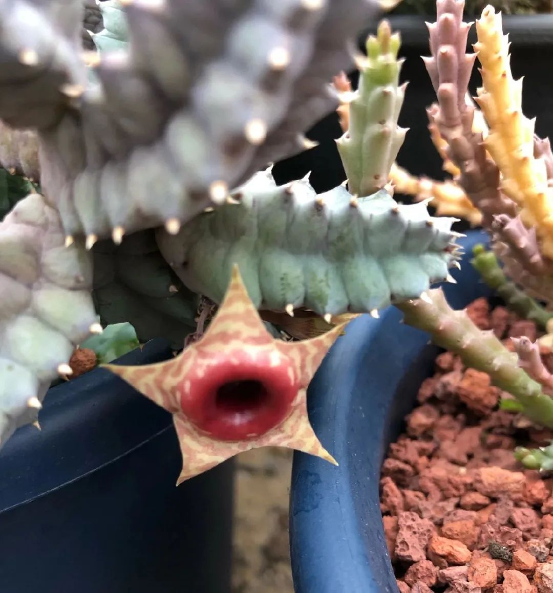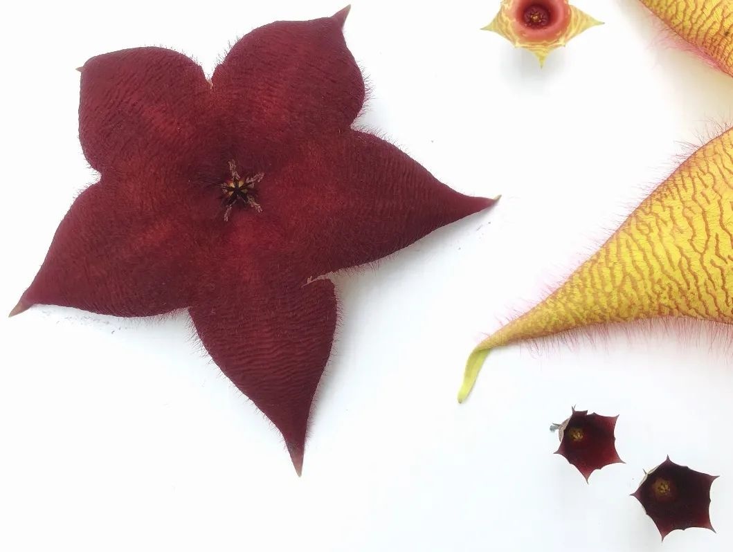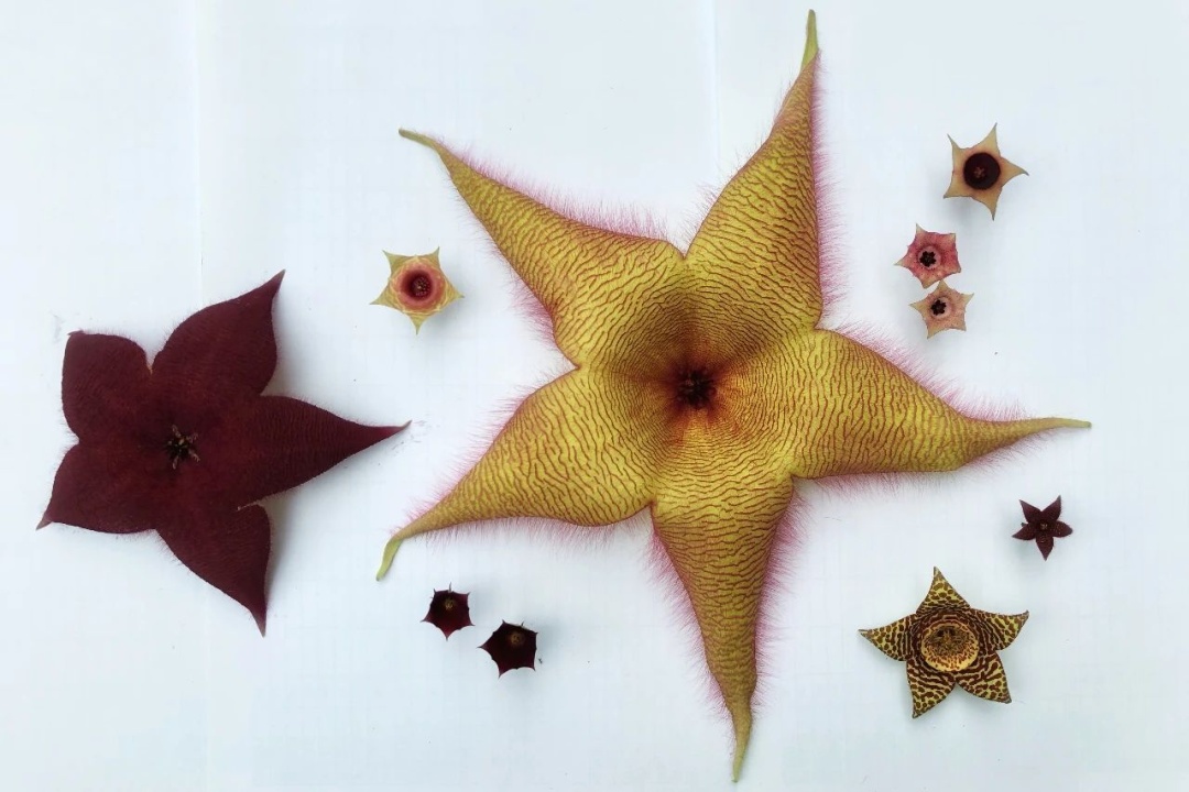 这种五瓣大花有点变化多端,或多或少有淡红色或淡黄色的突起,不同程度地与白色毛发交织在一起,散发出腐烂腐肉的臭味。花瓣边缘也有白色的毛发。原产于南非。花苞未开放的时候还蛮像嫩牛五方的!