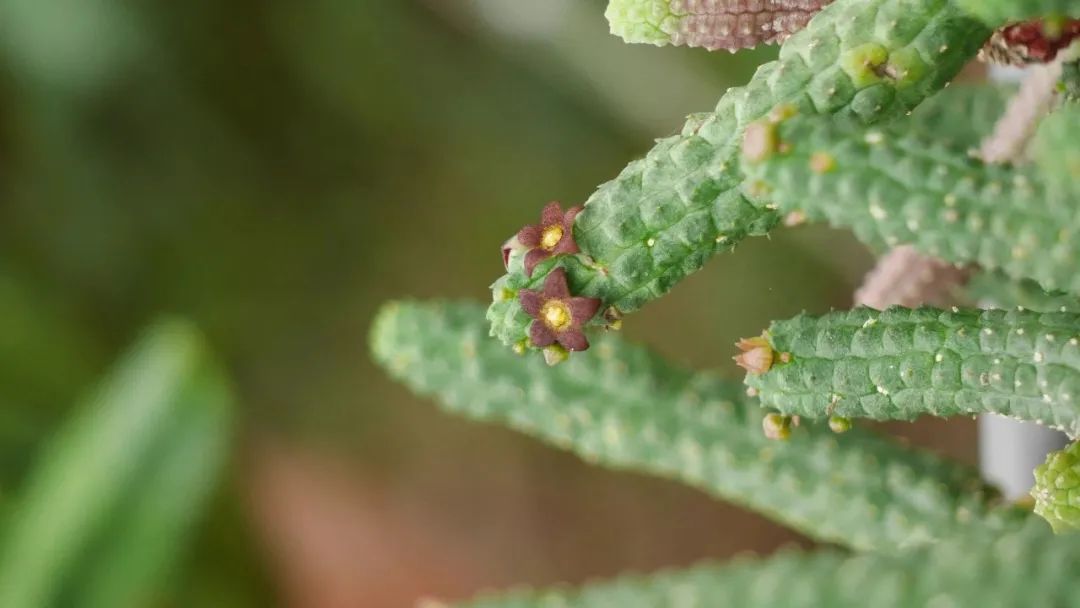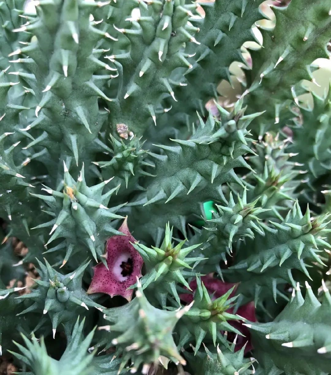 紫龙角Caralluma hesperidum萝藦科水牛掌属(水牛角属),分布于北非、地中海地区和南也门的索科特拉岛,又名水牛角。开出的花很招苍蝇。多年生肉质草本,植株灰绿色,表面长有紫褐色斑纹。看起来好像很硬,但摸起来却软软的。植株低矮,分枝多,开深褐红色星状的花,花有臭味,会吸引苍蝇,所以很少有人养。