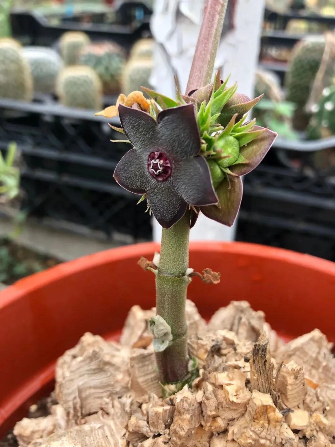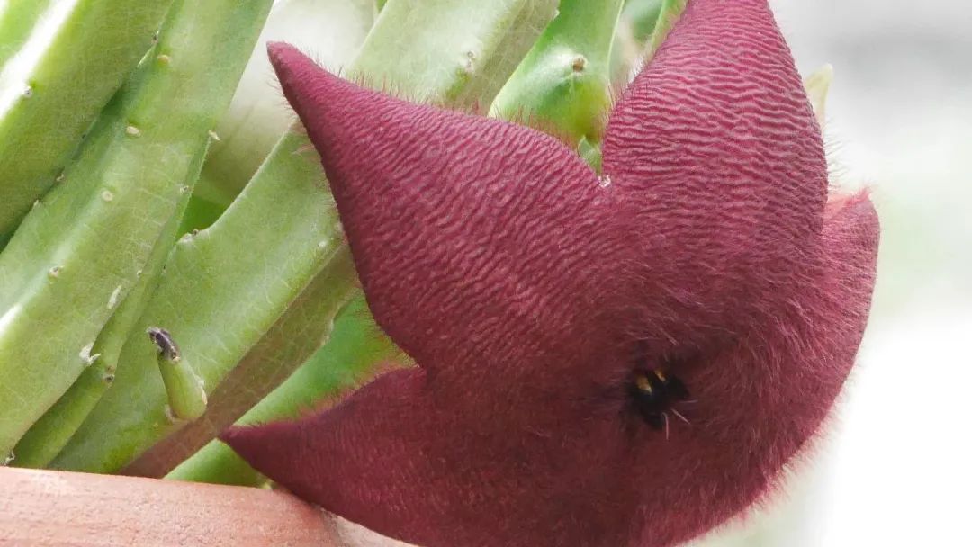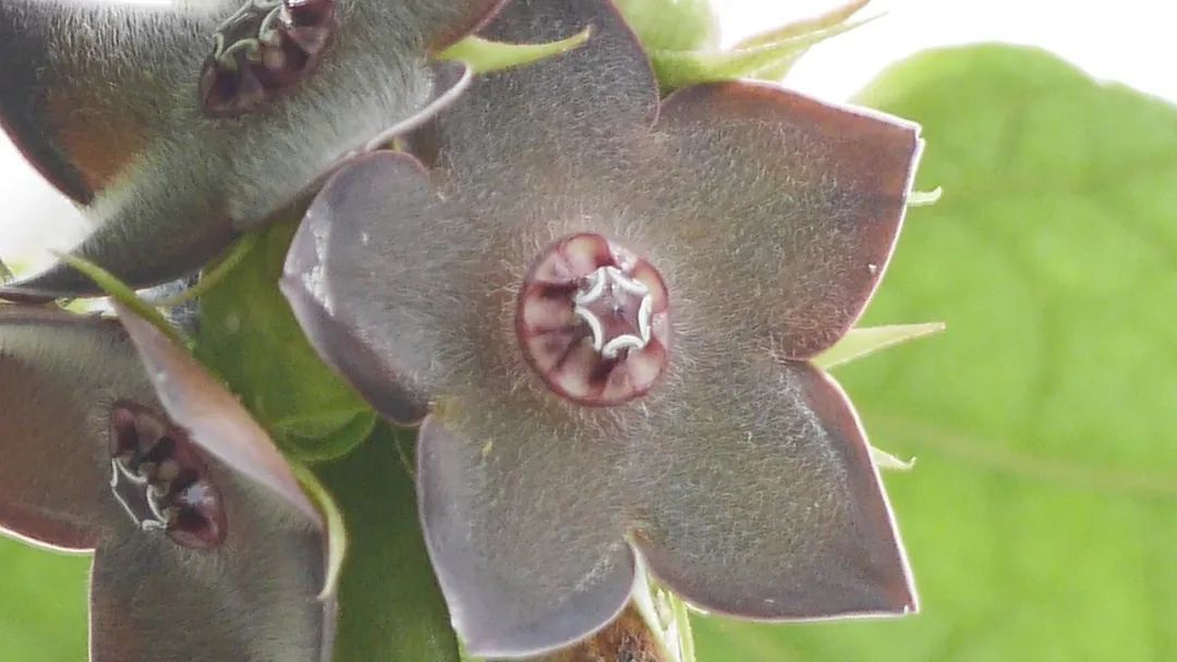 花为深栗色五角星形状,花瓣上有一层细软的毛。一如它的很多亲戚一样,花散发着一股腐肉味,主要靠苍蝇授粉。