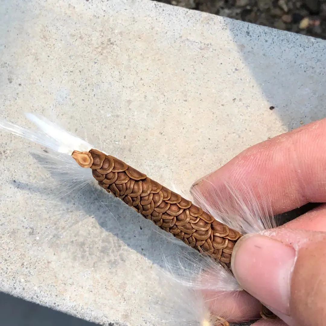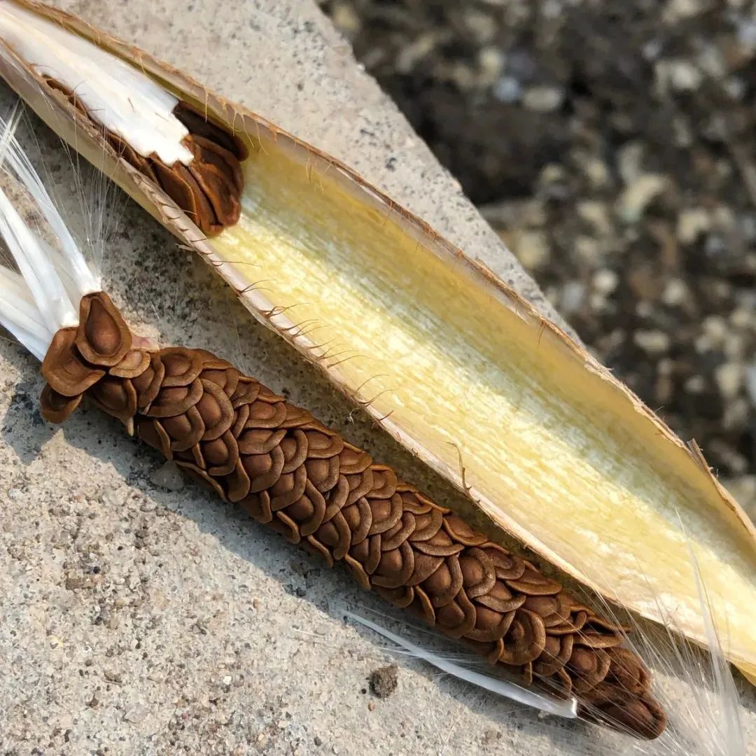 茎顶部附近产生浅黄色、橙色或紫色的臭味圆盘状花朵。苍蝇授粉后,结出一对近6厘米长的蓇葖果,里面充满了扁平的种子,每个种子的一端都有一个白毛。