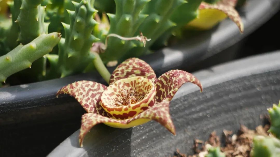国章属(豹皮花属)Stapelia大约有100种,茎无叶,四角形,边缘有齿,可能是短柔毛,茎直立生长,主要从基部分枝,在强烈日光下可能发展成为红色。