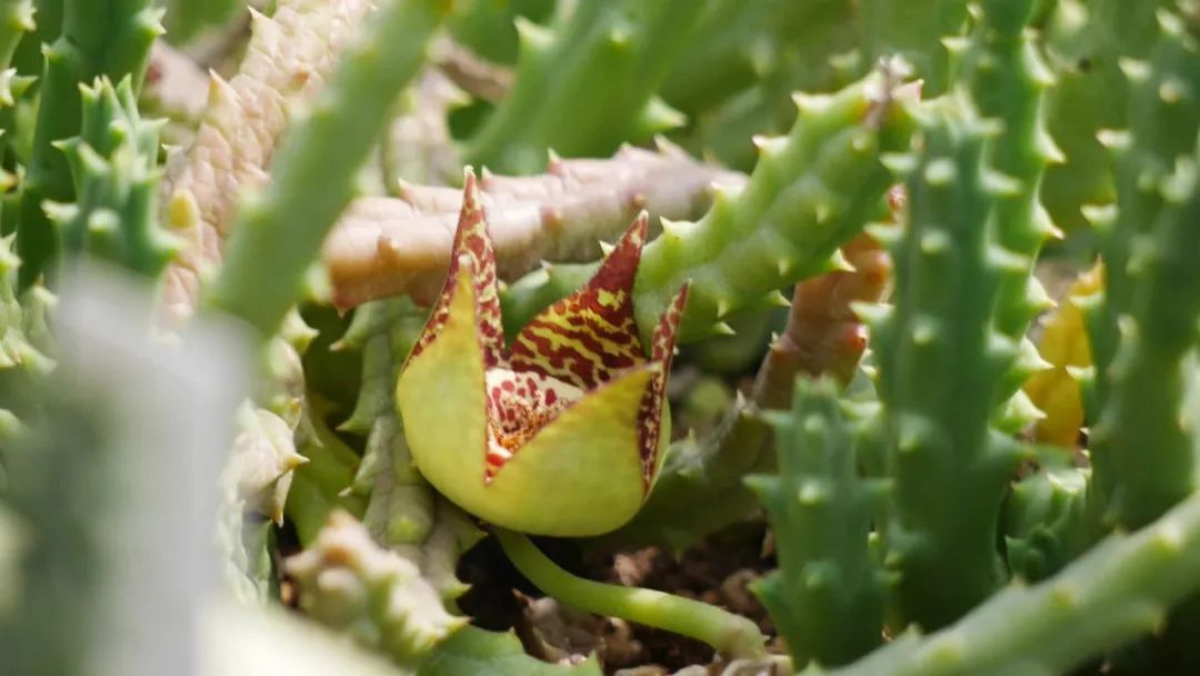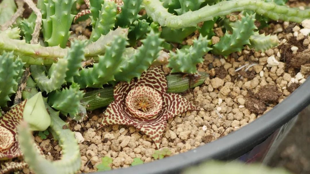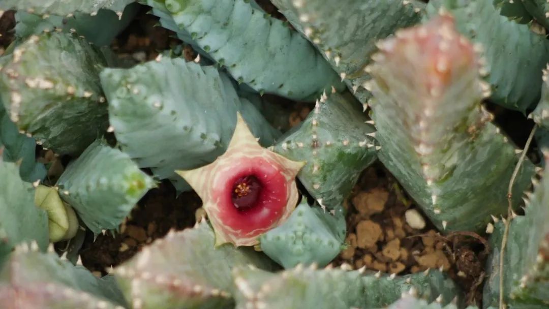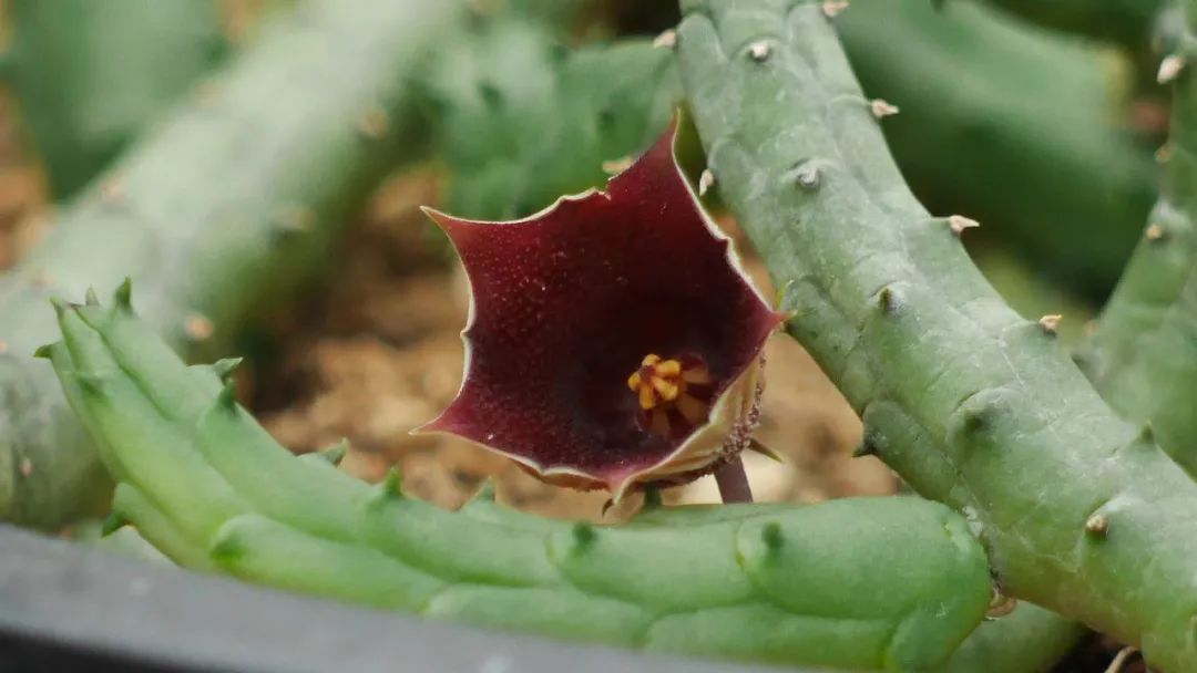 阿修罗Huernia pillansii是来自南非开普敦的一种有趣剑龙角属植物,在夏末和初秋开放。茎上密集排列的小细齿使这个物种在各种展会上脱颖而出。