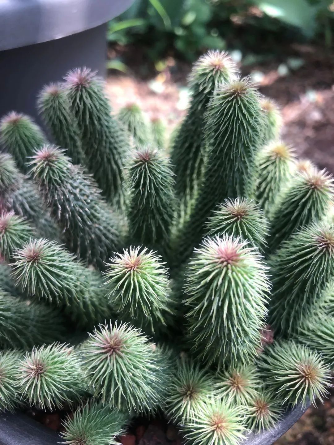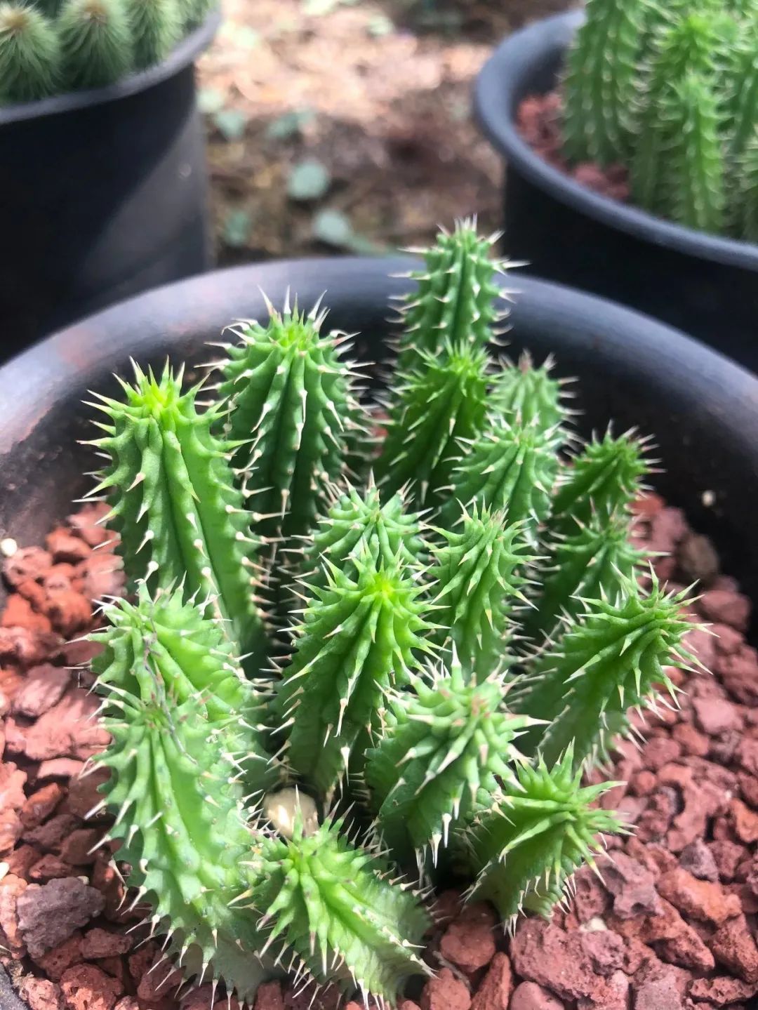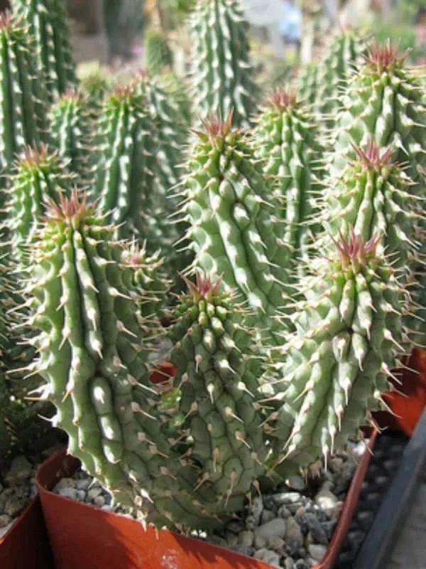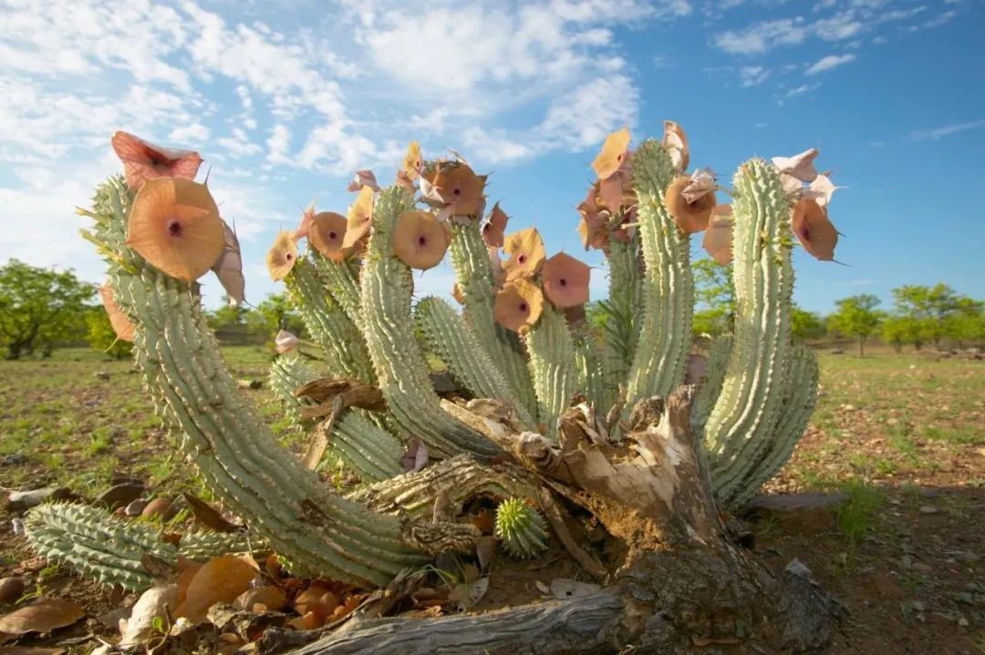 丽杯角Hoodia gordonii也叫卡拉哈里仙人掌、布什曼的帽子,纳米比亚王后。直立的绿色茎秆最高至3英尺高,覆盖着垂直成排的结节,并合并成棱。每个结节带有一条白色的刺。茎在其基部分支,产生丛生。