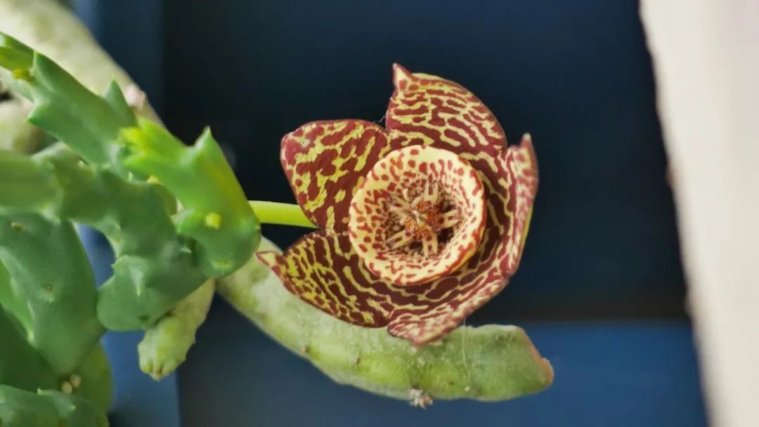 牛角Orbea variegata种加词来源于variegatus是“具有不同的颜色”的意思。它具有深绿色的分支茎,开始直立,但随着伸长而变平。