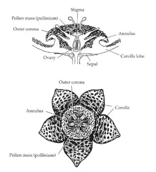 长茎上的花有五裂,常为扁平,花冠深裂为三角形,副花冠有两个五瓣轮,一个内轮和一个外轮,通常为红色,紫色或黄色,常带有趣的带状图案。多个品种都会产生腐烂腐肉的腐臭气味,以吸引吹粉蝇作为授粉者。在开花时常常会看到有苍蝇在花的中心产卵。这就解释了它们的俗称“腐肉花”的原因。