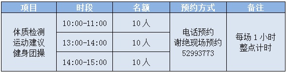 内容:身高体重,血压,柔韧,平衡,力量,反应,仰卧起坐,俯卧撑等指标,根据测试结果免费为市民提供有针对性的“运动处方”。