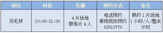 羽毛球:8:00-22:00