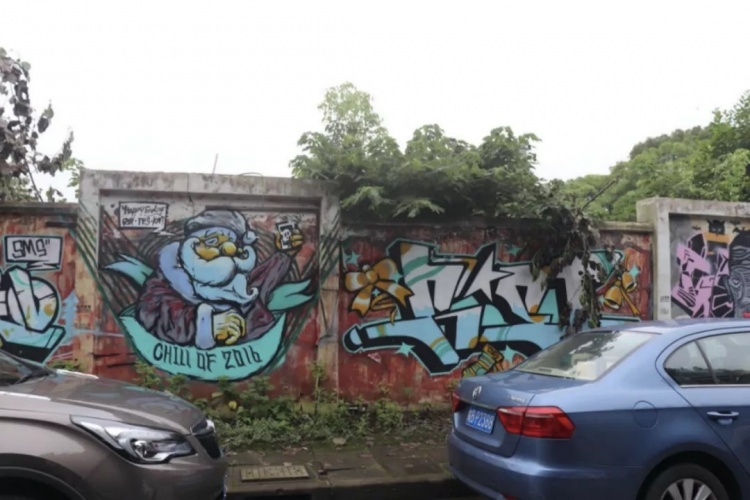 清晨的道路洁净清幽,一路走来,校区门外围墙上往届学生的设计作品格外吸引眼球。