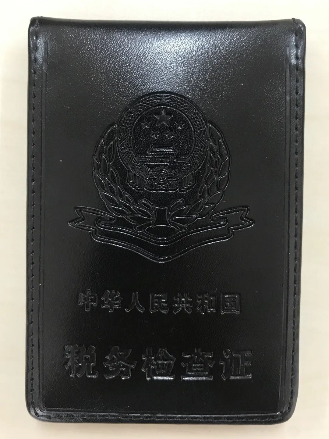 皮夹外部正面镂刻税徽图案、“中华人民共和国税务检查证”字样,背面镂刻“CHINA TAXATION”字样;
