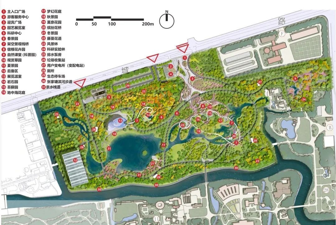 此次北区改扩建工程东起龙吴路,西至潘家塘河,北至罗城路规划红线和上海市园林科学规划研究院用地边界,南临张家塘港,总用地面积22.24公顷,建设周期预计为2年。按照“国内领先、国际一流”的目标和建设要求,北区建设内容与南区从地形地貌、植物展示形式、植物品种选择等方面错位发展,通过花丘、花岛、花谷、花廊、花溪、花坡、花桥等多种展示形式及不同的空间尺度来表达季节主题和特色专类植物,进一步增加植物展示主题与植物品种,着力打造“上海大花园”。
