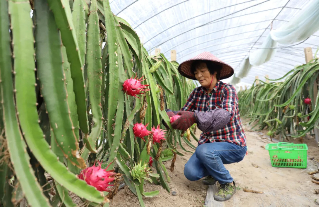 在上海枫梅果园火龙果种植基地里,只见一株株碧绿的火龙果树攀附在立架上向外伸展,工作人员正忙着将错落在枝头的红艳果实一一采入篮中。
