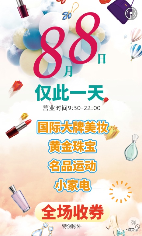 8月8日,新世界全城购物送券,服饰鞋类运动用品主力品牌满500送300元券,化妆品全场满500送150元券,小家电满500送250元券,部分服饰品牌满500送500券。