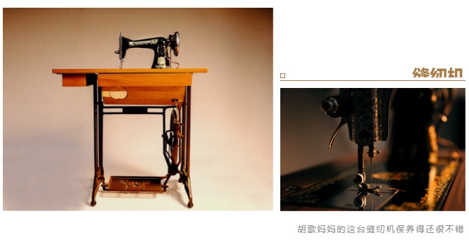 穿过悠长岁月,铁铸的机架和脚踏板让胡歌想起来小时候那爿15平方米的老式洋房,“印象中缝纫机就放在卧室,有布头罩子。那时我喜欢坐在椅子上,用脚踩在缝纫机踏版上,幻想着自己正驾驶小汽车。可能出于对工业设计的好奇,也会经常摆弄机器右下方的小扳手。”