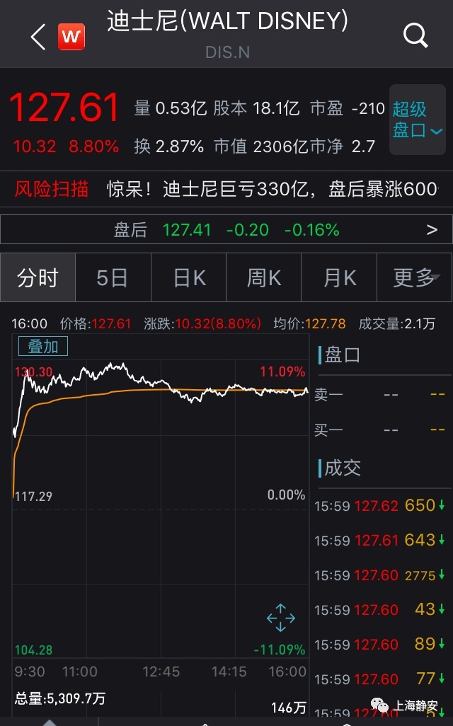 迪士尼财季亏损50亿,股价反而涨超8%