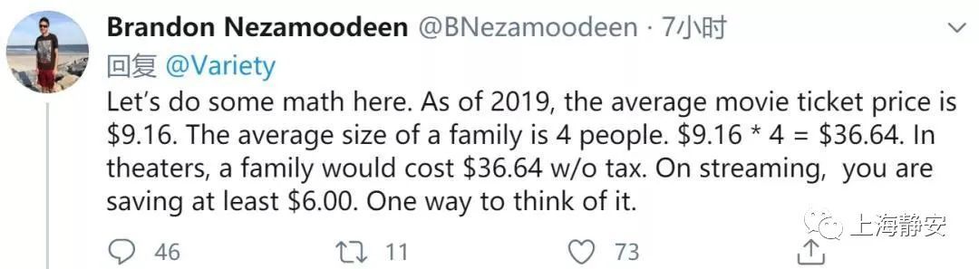 在推特上,也有网友认为这个看似昂贵的票价可以接受,毕竟考虑到全家人可以在自己家里反复观看这部电影,比四个人去电影院看一次电影还要略微便宜。