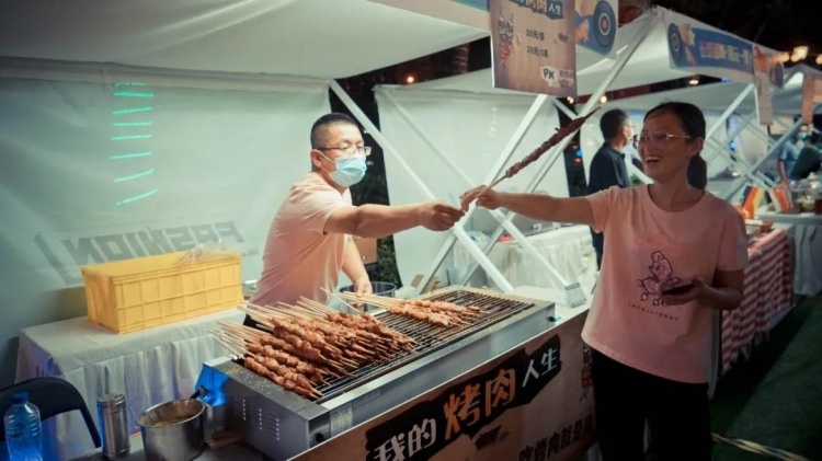 长泰广场的夜市汇集了各种口味。这边烤羊肉串在铁板上滋滋作响,那边的牛排又飘来阵阵香气。大家化身“小火车”,在夜市上一路“逛吃逛吃”不停。沿街餐饮商户开放露天席位,让游客享受这份独属夏天的休闲惬意。