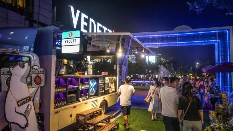 记者探营看到,夜色中,临近金科路的长街被各色灯火打造成了一片光影的海洋,走进这片灯火长街,最先吸引目光的就是街口的一辆“啤酒巴士”。巴士被改造成酒吧吧台的模样,吸引路人纷纷驻足留影。除了普通的生啤,市民游客可以在啤酒巴士上品尝到特色的莓果啤酒,“啤气”个性十足。