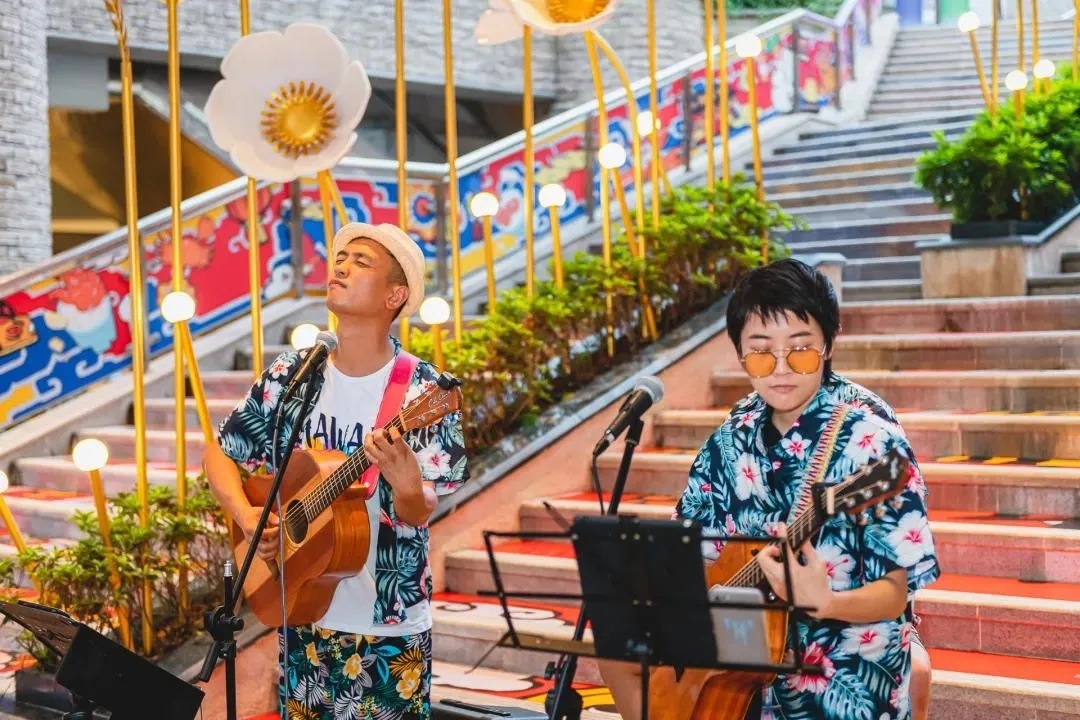 华灯初上,长泰广场夏日限定夜市“长泰皆IN·潮玩一夏”迎来一波又一波下班白领、周边居民、亲子家庭。人们聚集在这里,听着摇滚爵士,品尝啤酒烧烤,开启一站式“逛买吃玩嗨”的夜生活。周末晚上6点,现场乐队准时登场,点燃夜间舞台。魔术、摇滚、民谣、爵士、街舞、脱口秀表演等节目都将为游客们一一呈现。亲子互动区也备受欢迎。