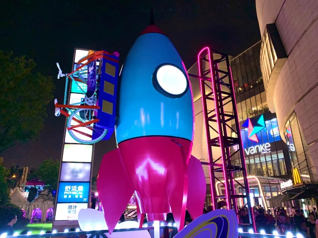 七宝万科邀请了涂鸦艺术家施政设计了一系列星空涂鸦作品,指引地贴、道旗、灯箱、玻璃贴等随处可见。现场还设置了一面涂鸦墙,市民可以拿起画笔,描绘心中的小宇宙。现场最吸人眼球的大概就是火箭装置,人们纷纷打卡留影。