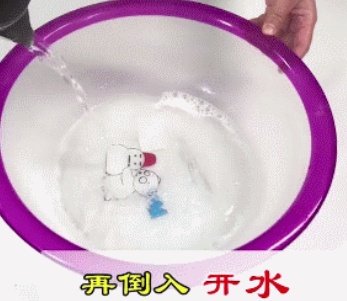 准备一勺洗衣粉,再加入一勺食用碱,然后倒入开水。