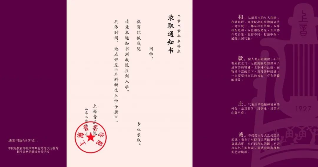 上海音乐学院今年的录取通知书