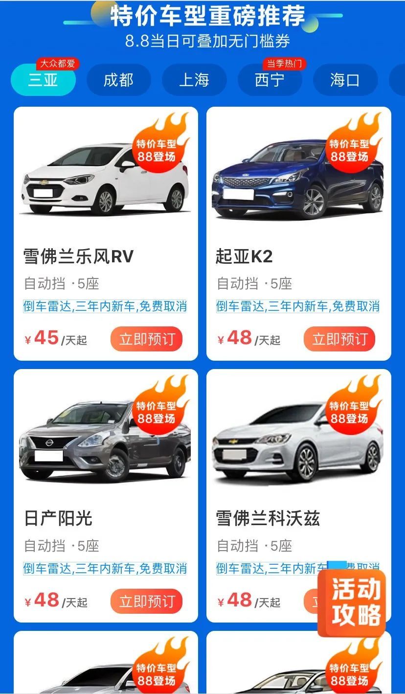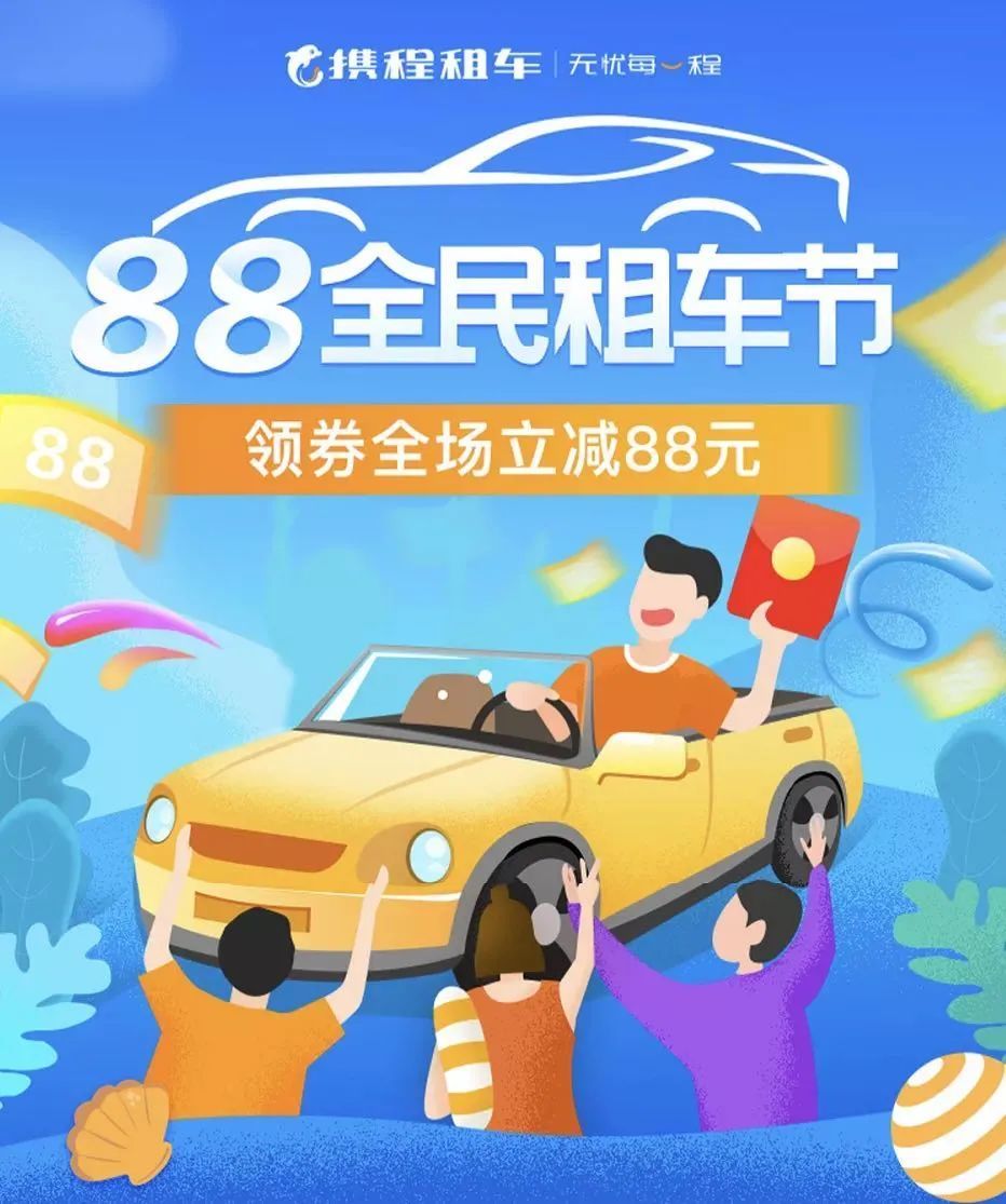 携程宣布启动“88全民租车节”,8月8日当天,国内自驾租车产品(港澳台地区不参加)将迎来众多叠加立减优惠,部分车型租金低至0元。