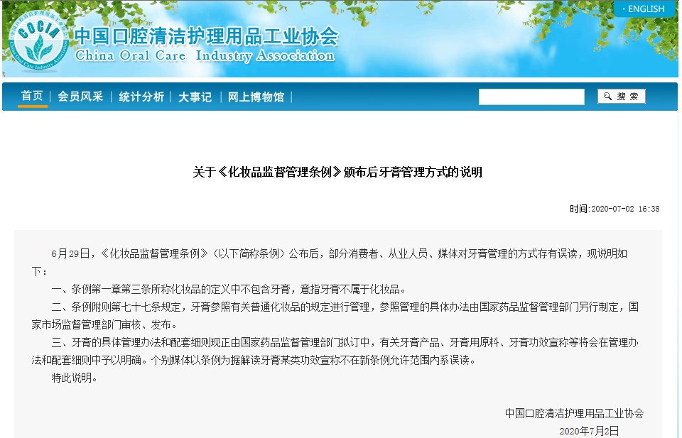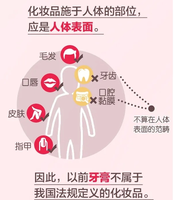 由于口腔并不在新条例化妆品定义中所列举的人体表面之列,因此牙膏不算化妆品,但其管理模式还是按照普通化妆品的规定进行,可以使用“防龋”“抑牙菌斑”“抗牙本质敏感”“减轻牙龈问题”等宣称。