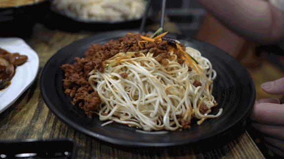 哒啦~~美食上桌,先吃好评最多的辣肉冷面,不同于常见的肉碎浇头,这边的辣肉是“抱团”的,一夹就是一大块,吃起来味道很浓郁,面的味道甜辣适中,不能吃辣的小伙伴也毫无压力,只觉得开胃~