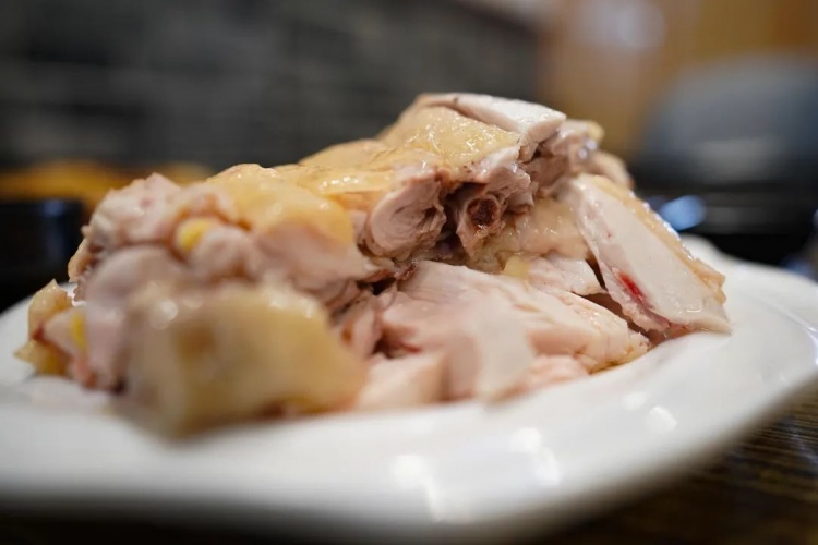 周大厨说,白斩鸡好吃的“奥义”就是活杀和鸡的“年纪”。原来,日月伴有自己的养鸡场,每天都会运活鸡来上海,现杀后运到总店,再从总店运到各分店,所以这里的白斩鸡都是当天活杀的~在鸡的选择上,日月伴的鸡都选的是120天左右,没生过蛋的鸡,周大厨说,这时候的鸡,肉质最嫩,营养也相对好一些~