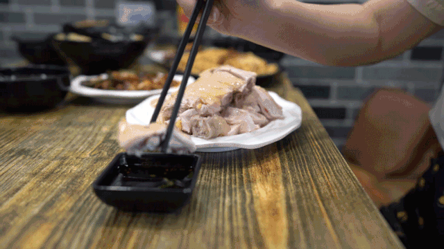 除了冷面,这里最多出现的还有白斩鸡,观察君尝了一下,鸡肉滑嫩有嚼劲,淡黄色的鸡皮冰冰凉凉,脆爽可口,感觉非常新鲜。